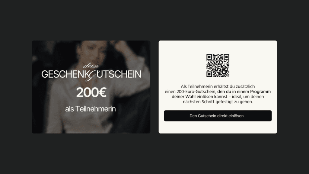 Als Teilnehmerin erhältst du zusätzlich einen 200-Euro-Gutschein, den du in einem Programm deiner Wahl einlösen kannst – ideal, um deinen nächsten Schritt gefestigt zu gehen.